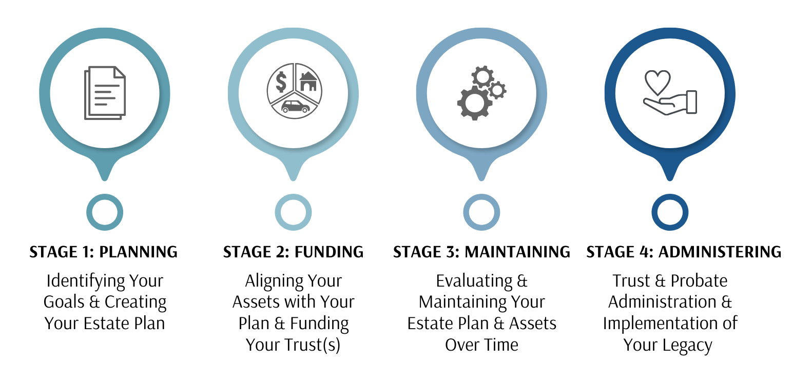 Some clients have found the step-by-step guideline (below) helpful in making the estate-planning process easier and more manageable. Check-ins with the Eckert Byrne team throughout the planning timeline ensure that our plans truly reflect our clients’ goals and wishes. We typically complete our flat-fee estate plans within 2-4 months of engagement, depending on the complexity of the scenario, which allows for the material discussed at meetings and calls to stay fresh in our clients’ minds.